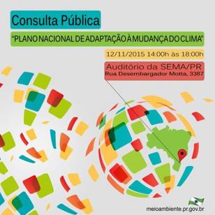 14:40 Consulta Pública Plano Nacional de Adaptação à Mudança do Clima O Fórum Brasileiro de Mudanças Climáticas, junto com o Fórum Paranaense de Mudanças Climáticas Globais, Secretaria de Mudanças do Clima e Qualidade Ambiental, do Ministério do Meio
