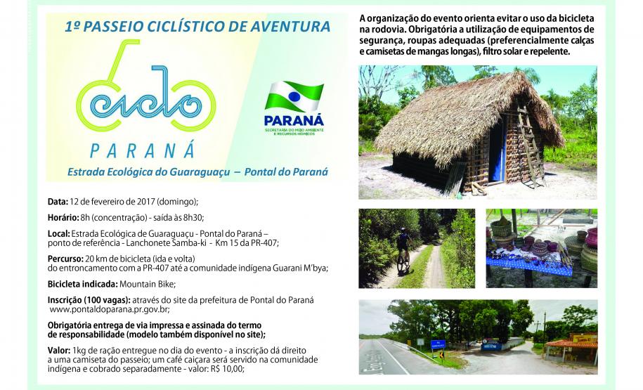 A SEMA promove neste domingo (12/02) o 1º Passeio Ciclístico de Aventura - Estrada Ecológica do Guaraguaçu - em Pontal do Paraná. Inscrições através do site da prefeitura de Pontal do Paraná - www.pontaldoparana.pr.gov.br