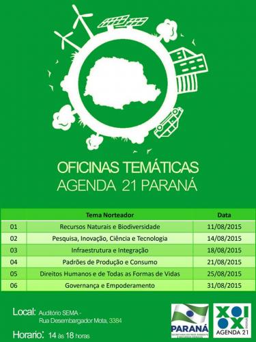 Durante o mês de agosto, serão realizadas pelo Fórum Permanente da Agenda 21 Paraná as Oficinas Temáticas, com intuito de sistematizar o material para a elaboração do documento “Agenda 21 Paraná” oriundo do texto-base, enriquecido com as contribuições das Conferências Livres e de Consulta Pública, realizadas em 2014.