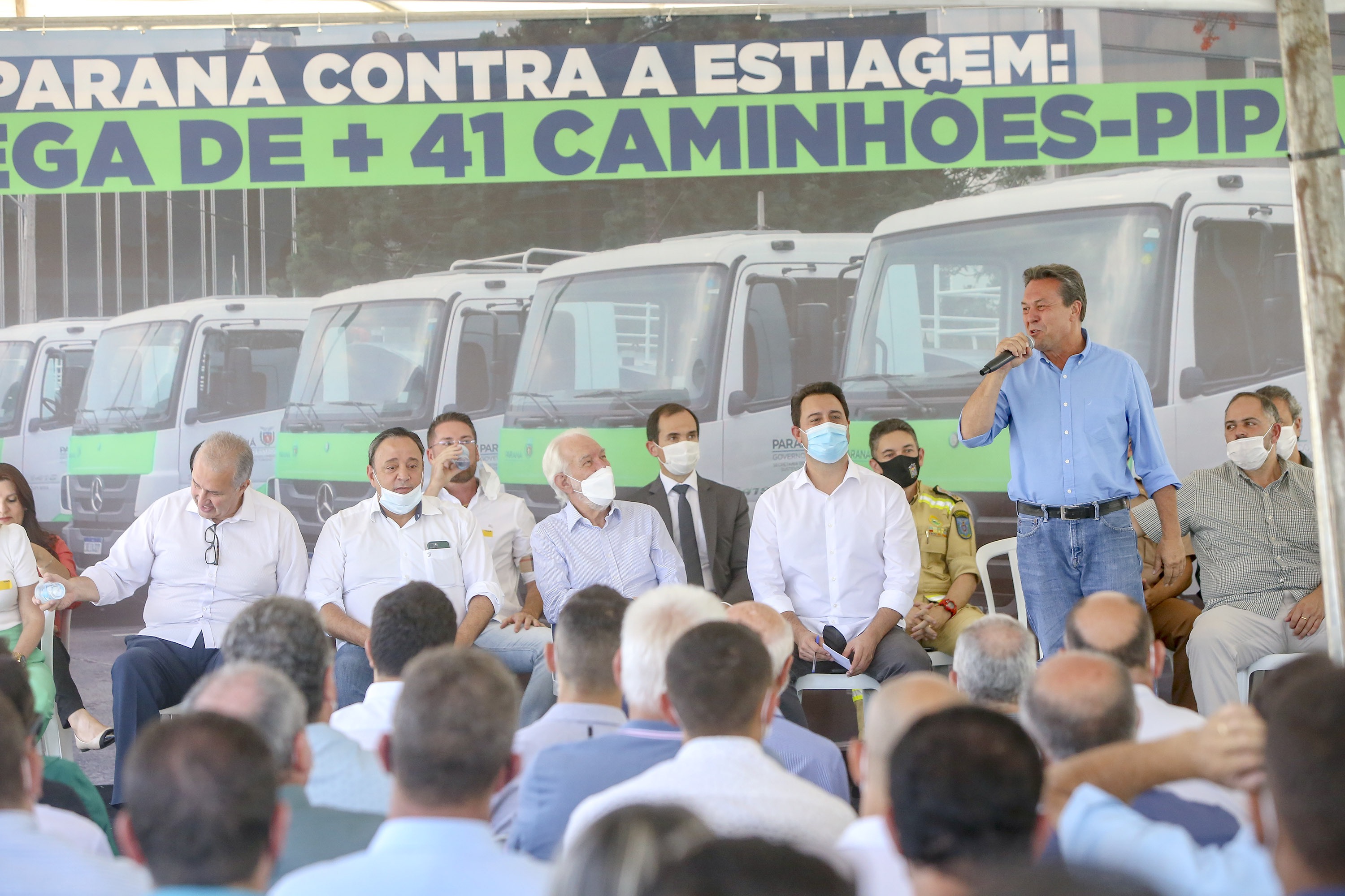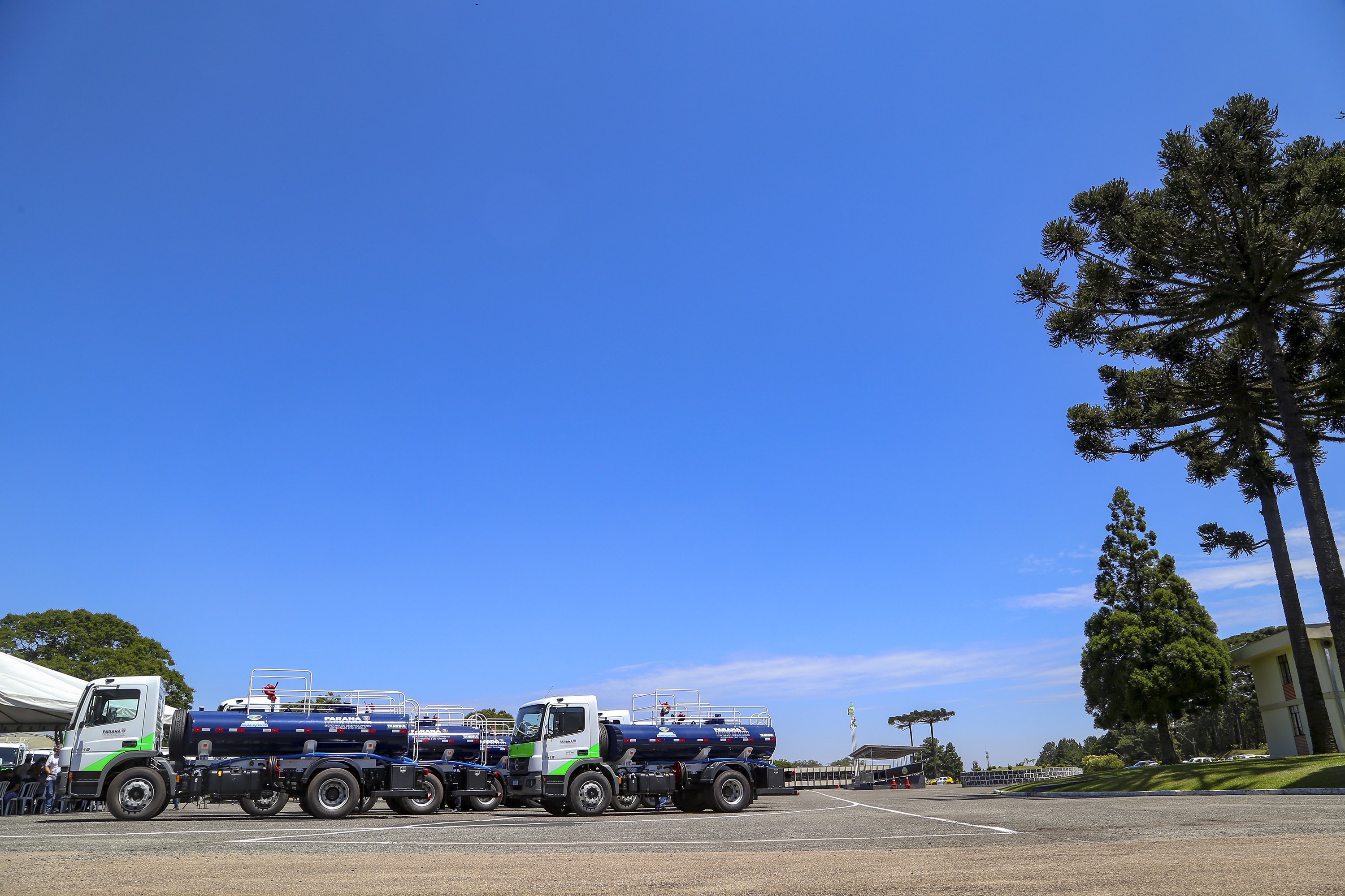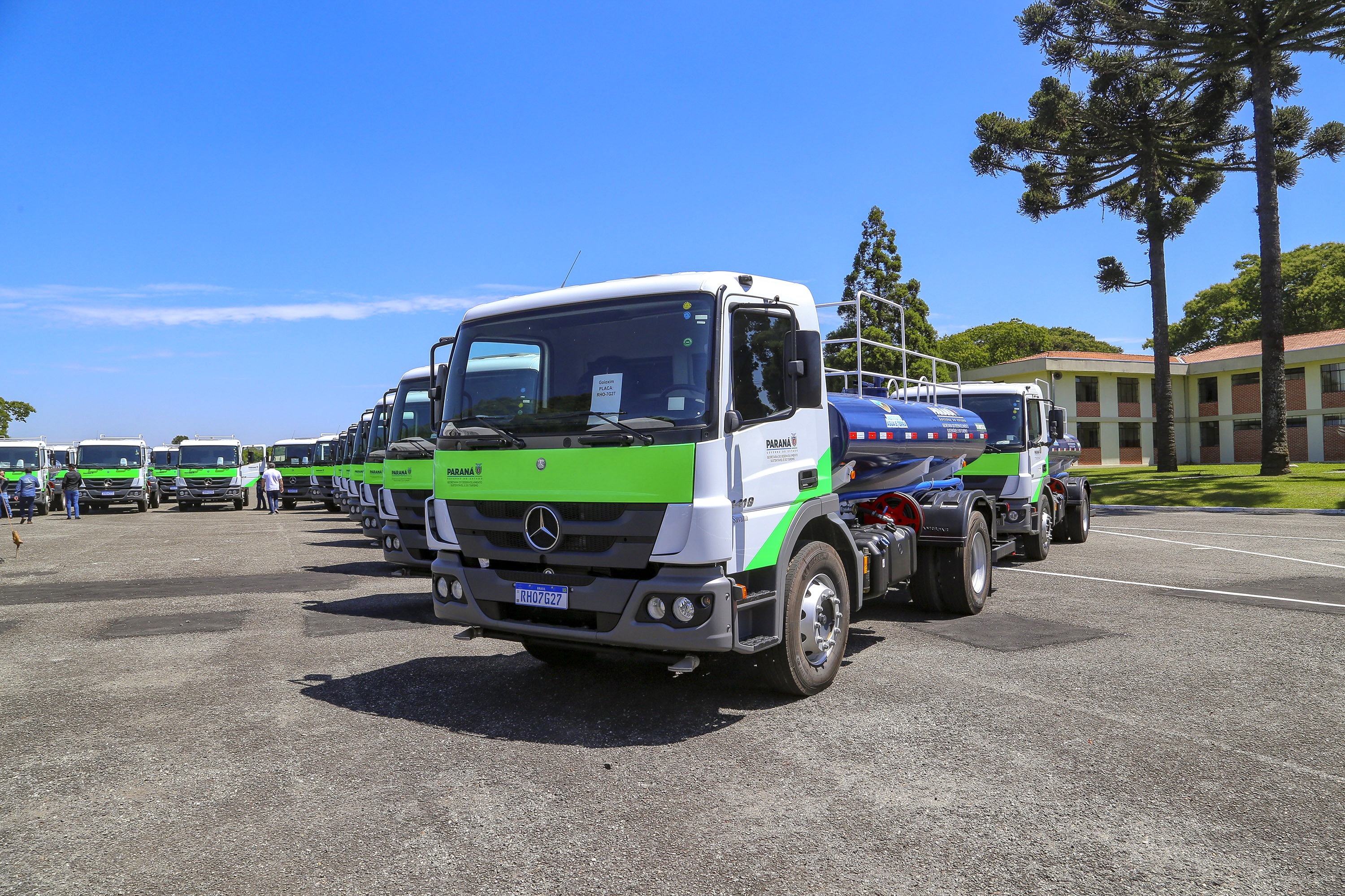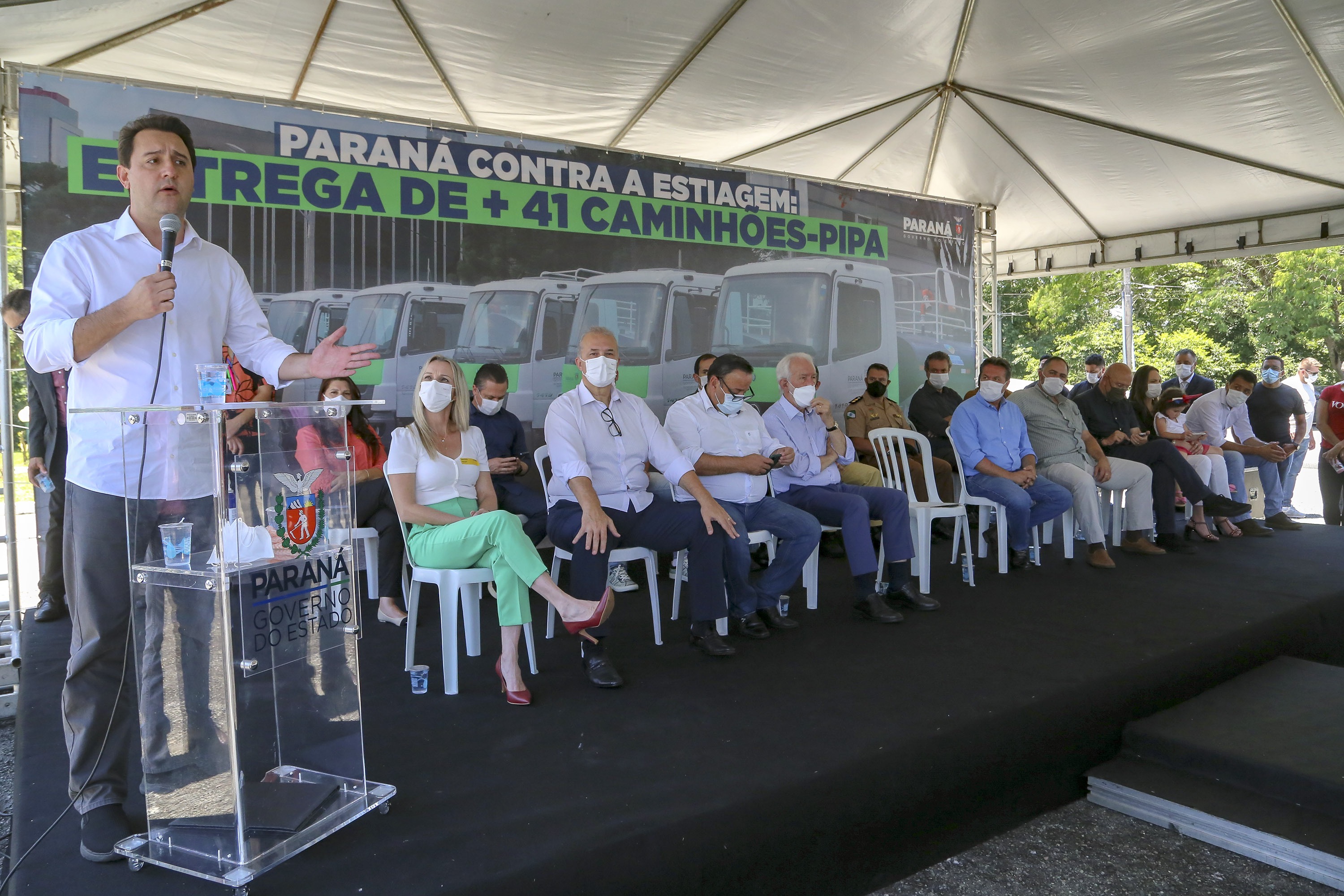 O governador Carlos Massa Ratinho Junior entregou nesta terça-feira (21), em cerimônia na Academia Policial Militar do Guatupê, em São José dos Pinhais, mais 41 caminhões-pipa para 40 diferentes municípios do Estado. Com isso, 176 das 399 cidades paranaenses (44%) receberam o equipamento desde 2019. Além disso, um veículo foi destinado para a Defesa Civil Estadual.