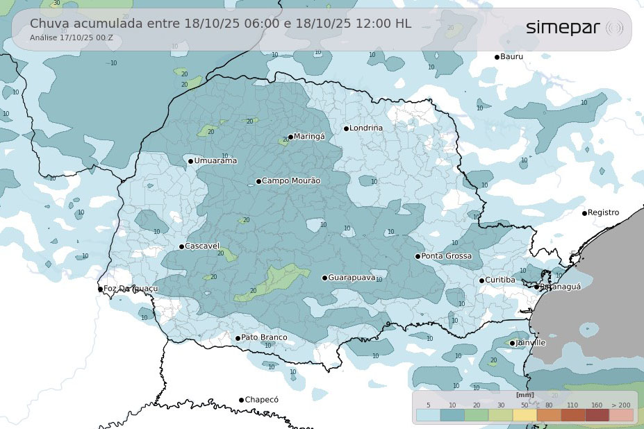 Com nova frente fria, primavera mantém alternância entre chuva, sol e ventos fortes no Paraná 17/10/2025 - 09:03