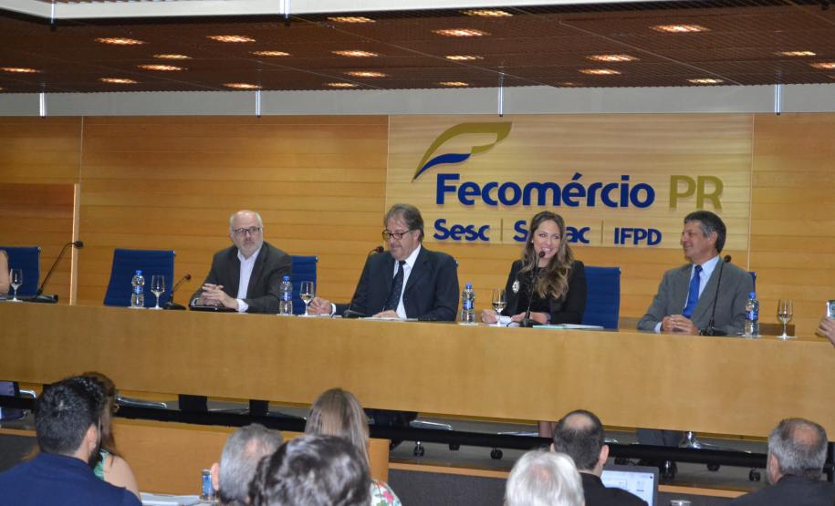 O secretário estadual de Meio Ambiente e Recursos Hídricos Antonio Carlos Bonetti, a deputada estadual Maria Victória e o vice-presidente da Fecomércio/PR Paulo César Naulack foram os convidados da primeira reunião do ano do R-20, grupo que trabalha na gestão associada dos municípios paranaenses na implementação da política nacional e estadual de resíduos.