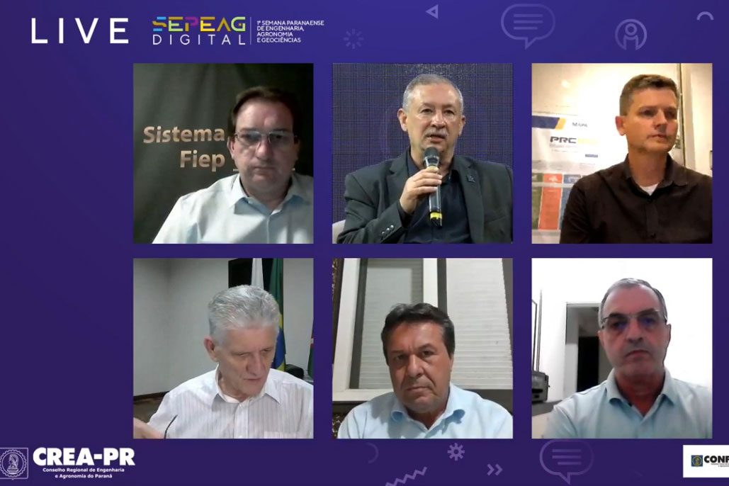 PRESENÇAS – O painel teve como mediador o presidente do CREA-PR, Ricardo Rocha de Oliveira. Participaram da abertura do evento online o governador em exercício, Darci Piana; os secretários estaduais do Desenvolvimento Sustentável e do Turismo, Márcio Nunes, e da Agricultura e do Abastecimento, Norberto Ortigara; o superintendente da Organização das Cooperativas do Paraná (Ocepar), Robson Leandro Mafioletti; e o gerente de Assuntos Estratégicos da Federação das Indústrias do Paraná (Fiep), João Arthur Mohr.