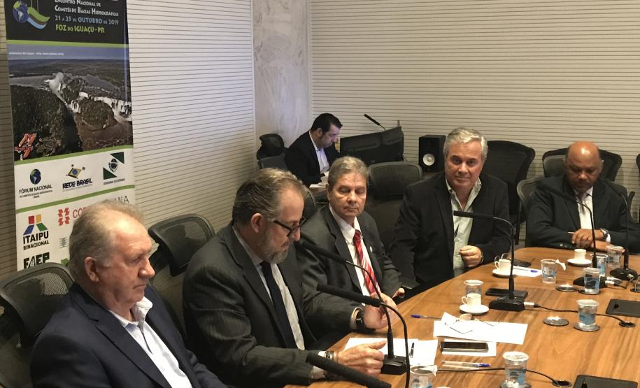PARTICIPAÇÃO - Estiveram presentes na cerimônia Hideraldo Buch e Lupércio Ziroldo Antonio, coordenador geral do Fórum Nacional de Comitês de Bacia Hidrográficas, e presidente da Rede Brasil de Organismos de Bacias Hidrográficas, respectivamente; o diretor de Gestão de Bacias Hidrográficas do ÁguasParaná, Everton Luiz da Costa Souza; além do superintendente de Gestão Ambiental da Itaipu, Ariel Scheffer, entre outros representantes de vários estados que integram o colegiado do Fórum Nacional de Comitês de Bacias.
