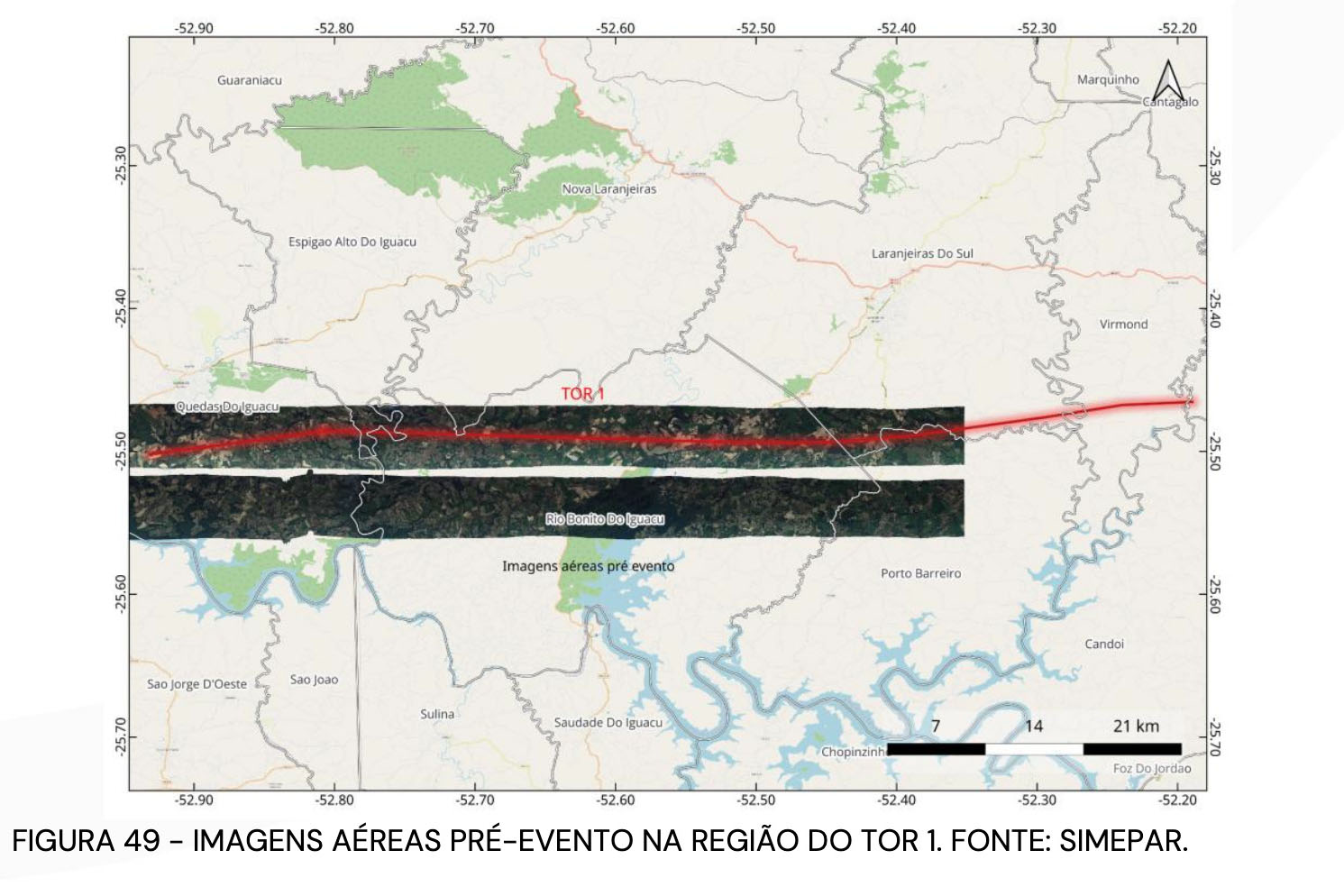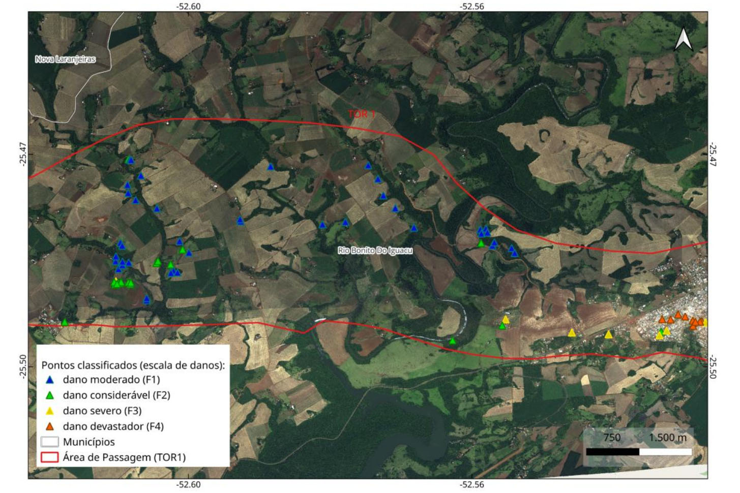 TRAJETÓRIAS – O Tornado 1 percorreu aproximadamente 75 km, com uma área de impacto estimada em 12.426 hectares. Sua largura variou de 750 metros em Quedas do Iguaçu para 3.250 metros na região de maior intensidade, em Rio Bonito do Iguaçu. Em média, a largura foi de 1.850 metros, refletindo o poder destrutivo do tornado, especialmente nas áreas mais afetadas.