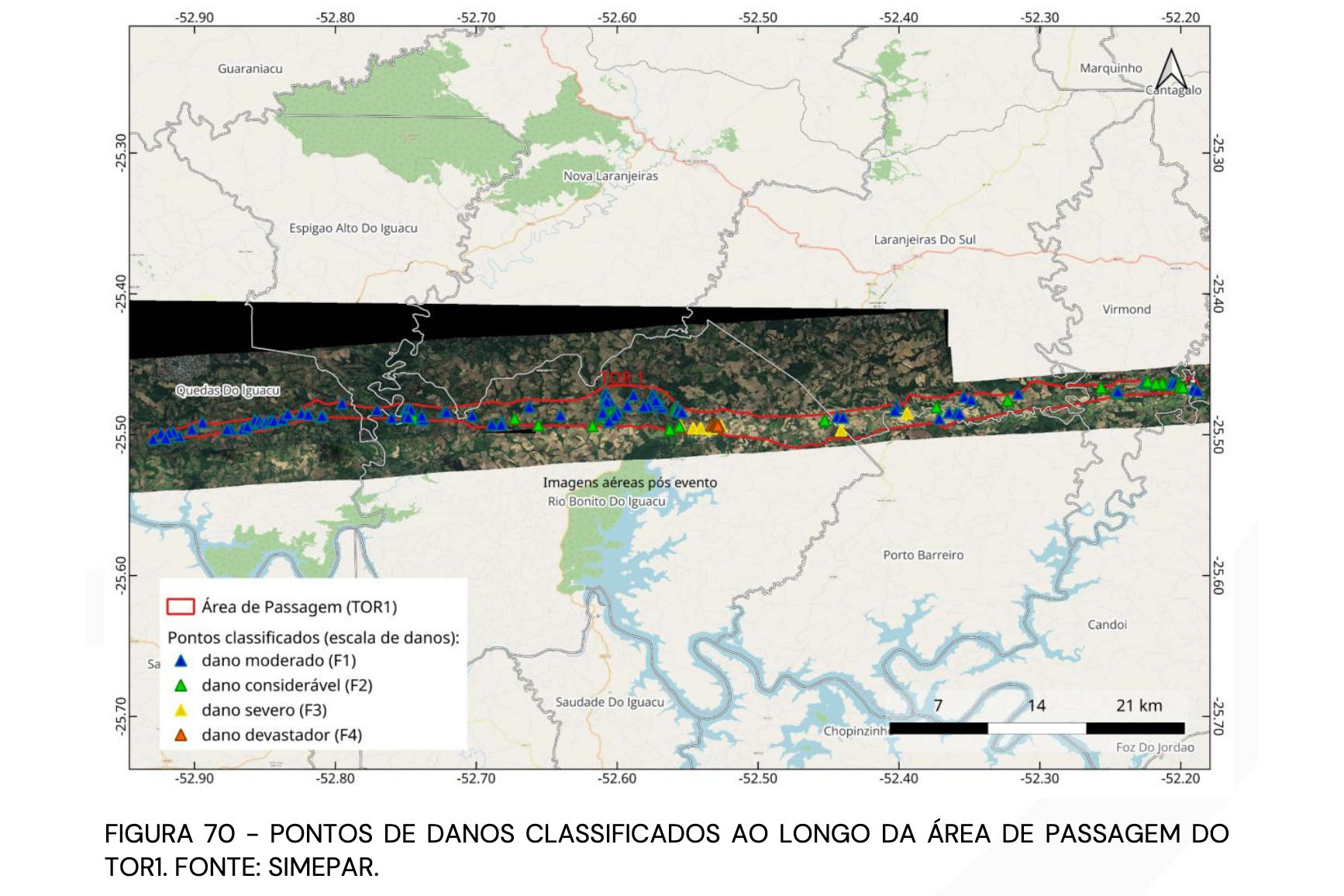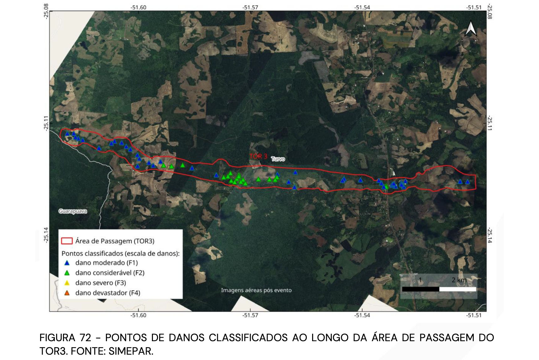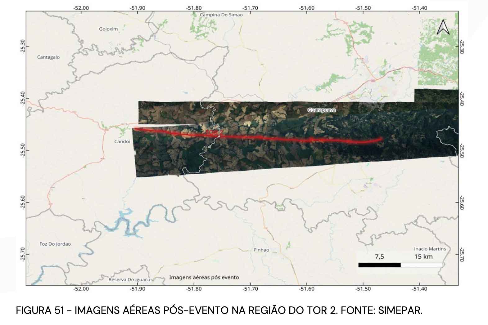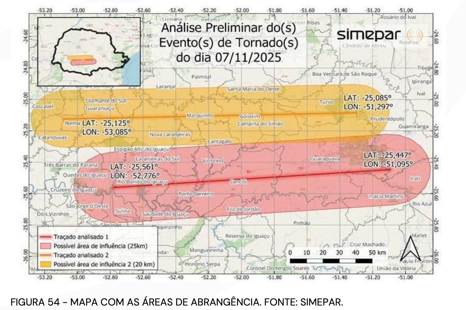 O Sistema de Tecnologia e Monitoramento Ambiental do Paraná (Simepar) concluiu nesta semana o laudo técnico que detalha a trajetória e a classificação dos três tornados que atingiram o Paraná em 7 de novembro. O trabalho descrito no documento, que tem mais de 130 páginas, elevou para F4 a categoria na escala Fujita dos tornados que atingiram Rio Bonito do Iguaçu e Guarapuava, e manteve em F2 a categoria do tornado que atingiu Turvo. Onze municípios foram atingidos: Rio Bonito do Iguaçu, Turvo, Guarapuava, Quedas do Iguaçu, Espigão Alto do Iguaçu, Nova Laranjeiras, Porto Barreiro, Laranjeiras do Sul, Virmond, Cantagalo e Candói.