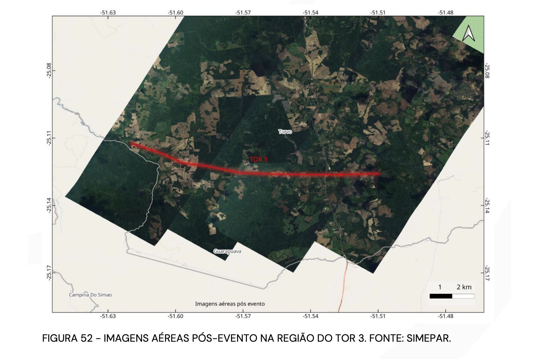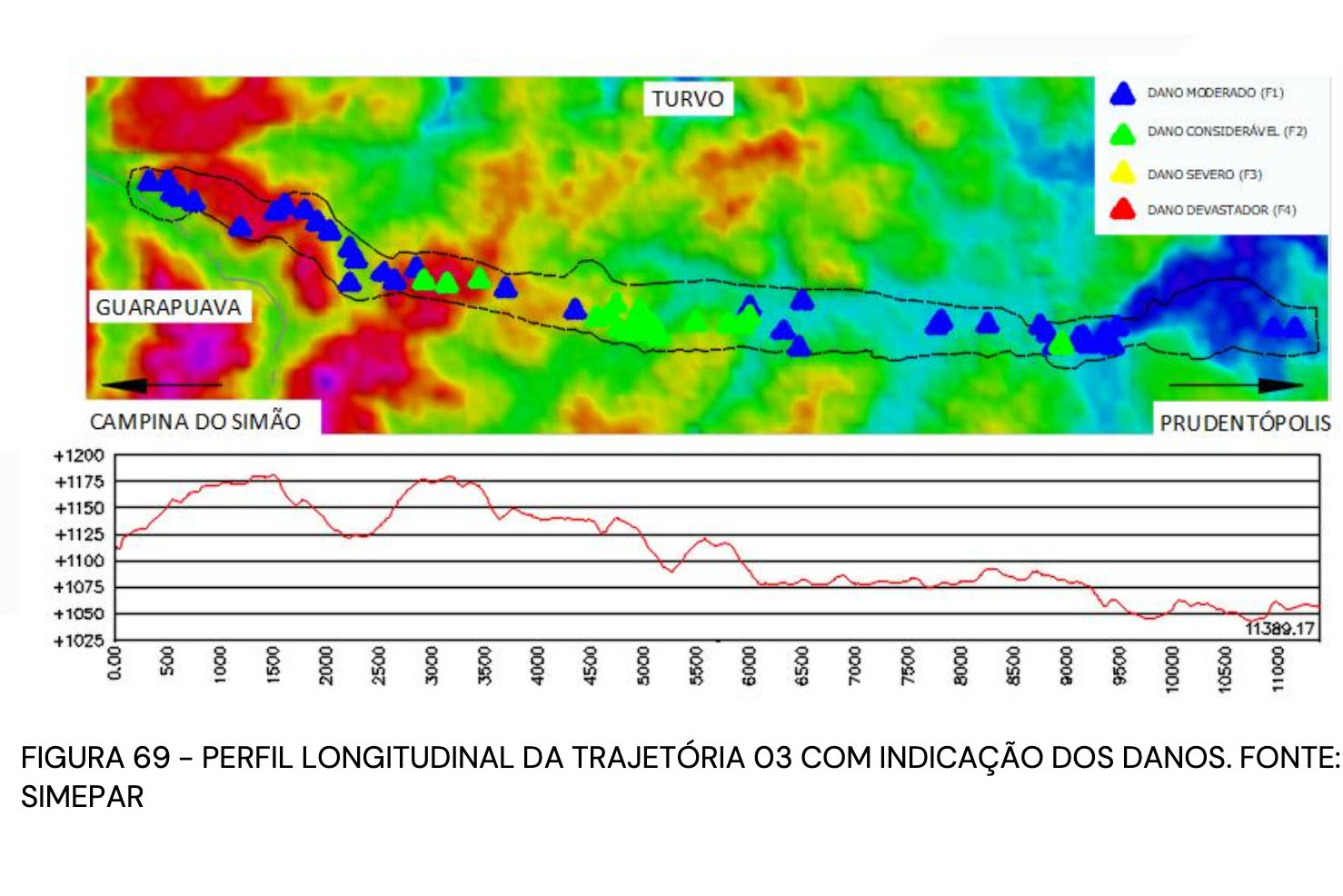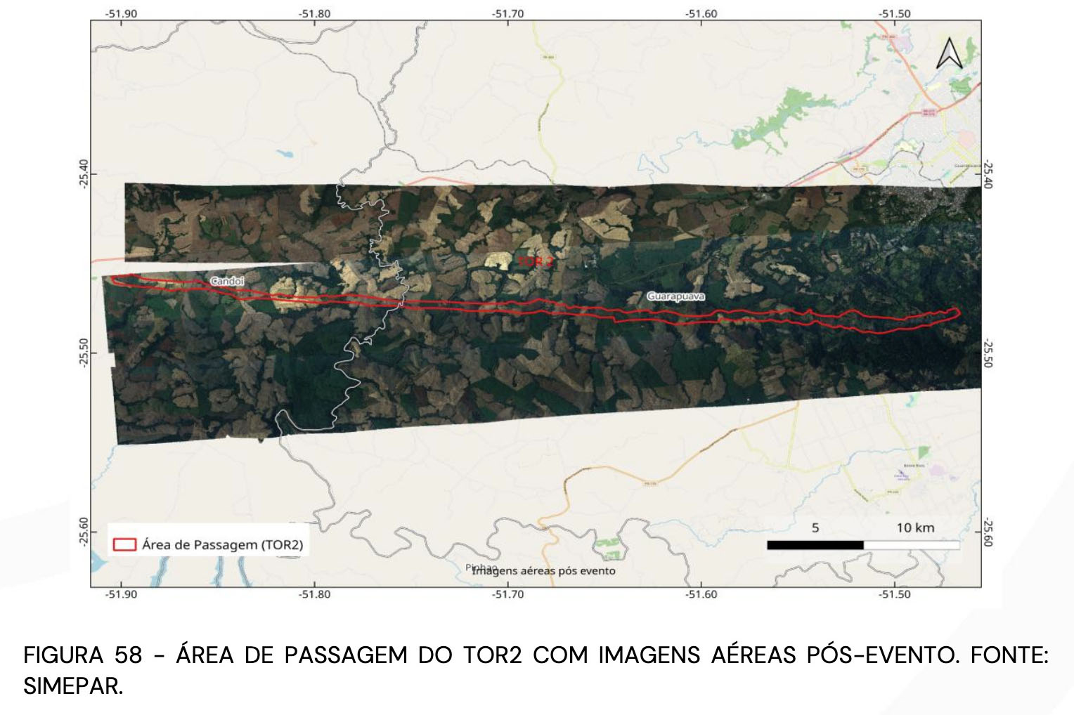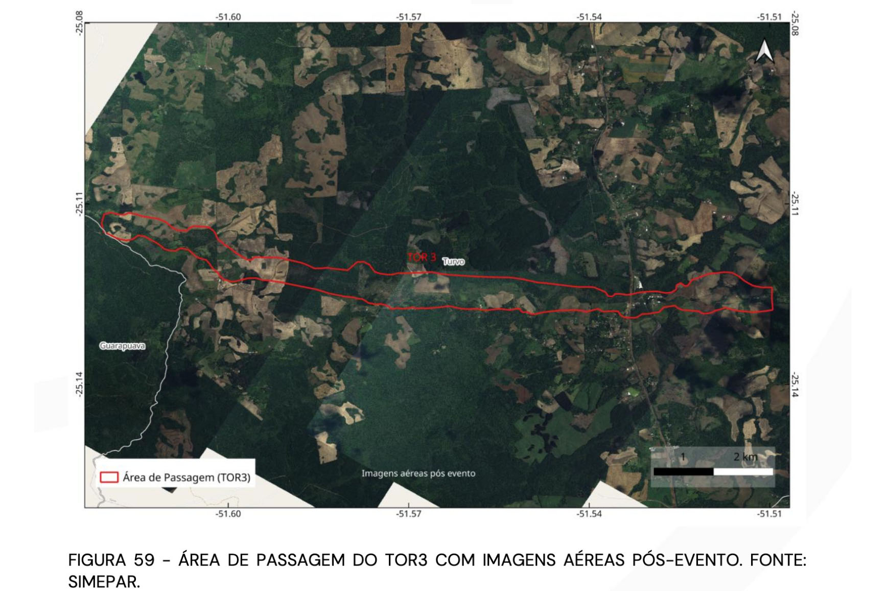 O Sistema de Tecnologia e Monitoramento Ambiental do Paraná (Simepar) concluiu nesta semana o laudo técnico que detalha a trajetória e a classificação dos três tornados que atingiram o Paraná em 7 de novembro. O trabalho descrito no documento, que tem mais de 130 páginas, elevou para F4 a categoria na escala Fujita dos tornados que atingiram Rio Bonito do Iguaçu e Guarapuava, e manteve em F2 a categoria do tornado que atingiu Turvo. Onze municípios foram atingidos: Rio Bonito do Iguaçu, Turvo, Guarapuava, Quedas do Iguaçu, Espigão Alto do Iguaçu, Nova Laranjeiras, Porto Barreiro, Laranjeiras do Sul, Virmond, Cantagalo e Candói.
