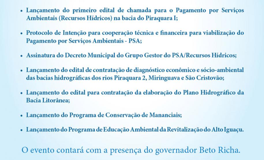 Haverá, ainda, o lançamento do Programa de Conservação dos Mananciais do Paraná e de mais dois editais: um para contratar o diagnóstico socioeconômico e ambiental das bacias de rios de Piraquara, São José dos Pinhais e de Castro, e outro para a elaboração do Plano Hidrográfico da Bacia Litorânea.