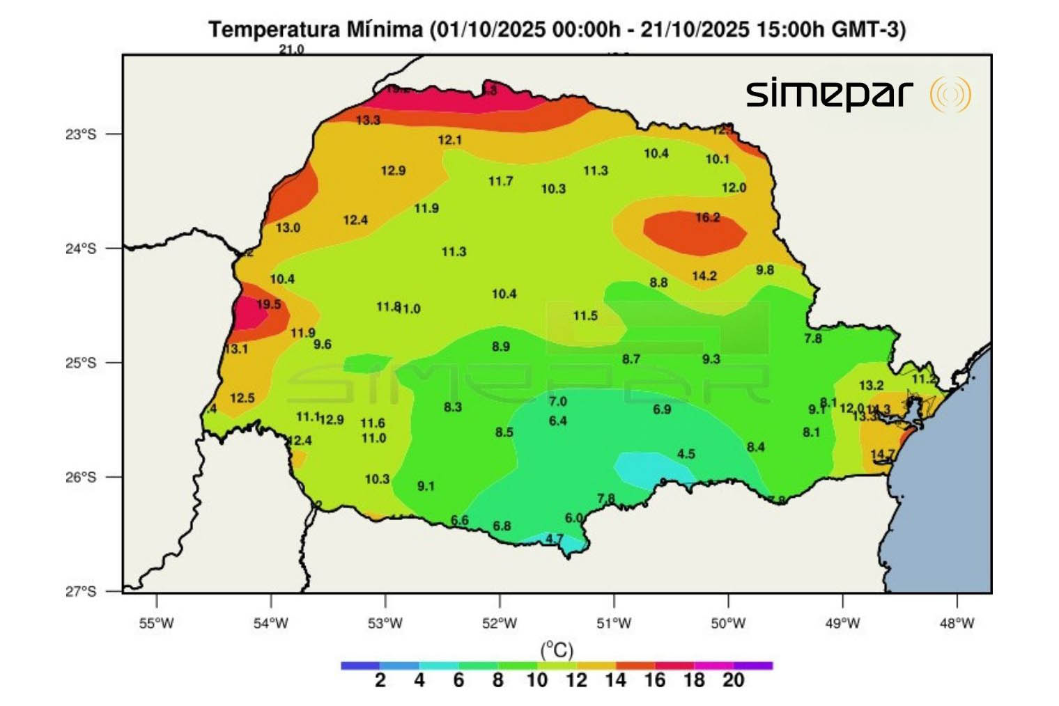 Uma massa de ar frio que está sobre o Paraná desde a passagem da frente fria no último fim de semana causou declínio nas temperaturas, e quatro estações meteorológicas do Simepar (Sistema de Tecnologia e Monitoramento Ambiental do Paraná) registraram entre domingo (19) e segunda-feira (20) as temperaturas mais baixas para outubro desde o início da série histórica.