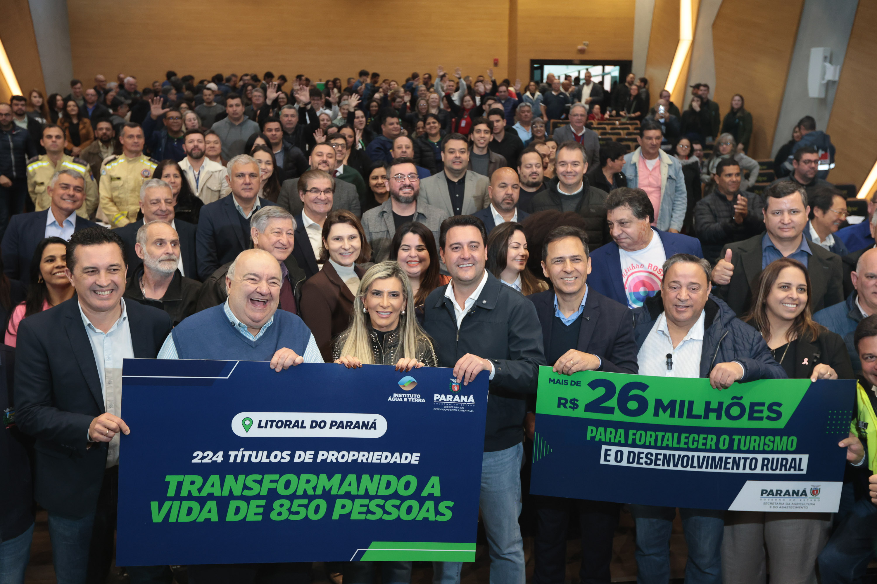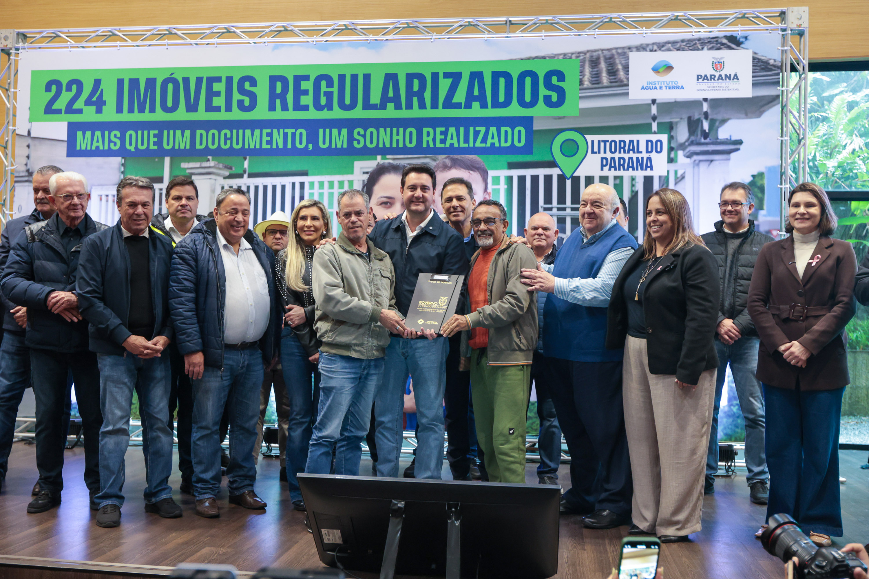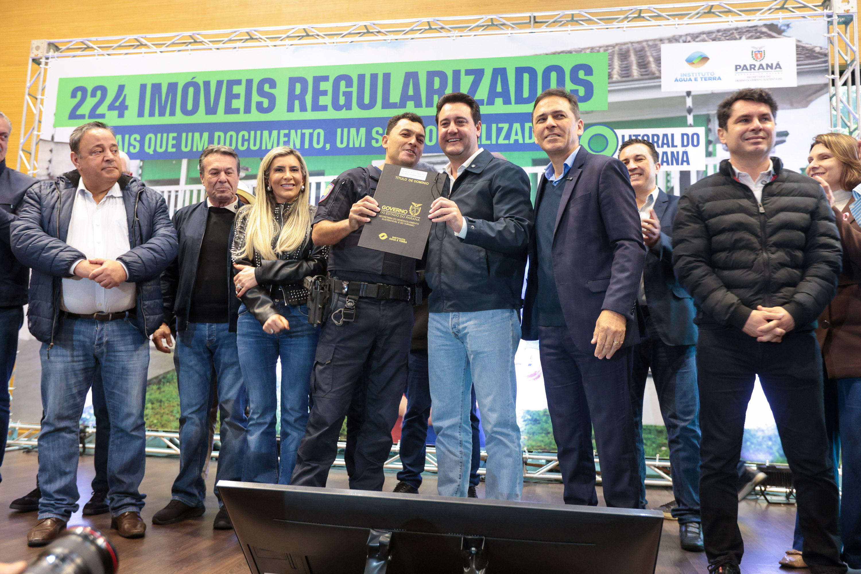 Uma cerimônia realizada nesta quinta-feira (9) no auditório do Instituto Superior do Litoral do Paraná (Isulpar), em Paranaguá, com a presença do governador Carlos Massa Ratinho Junior, marcou a regularização de 224 imóveis localizados em áreas devolutas em três cidades do Litoral. Durante o evento, foram entregues os títulos de propriedade a 212 famílias de Paranaguá, 10 de Pontal do Paraná e duas de Antonina. A ação, coordenada pela Diretoria de Gestão Territorial do Instituto Água e Terra (IAT), órgão responsável pelo programa, beneficia diretamente 850 pessoas. Durante a solenidade, também foram anunciados investimentos em maquinários para a região.