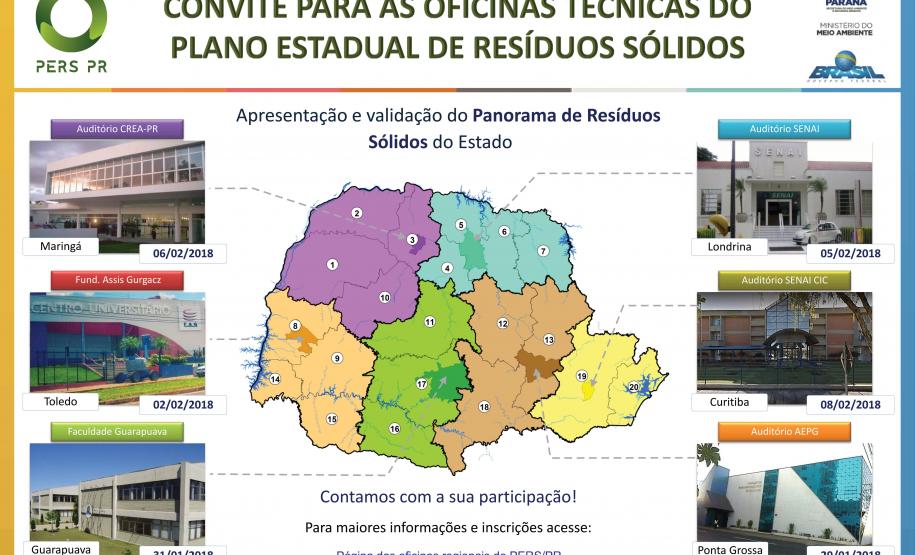As oficinas serão realizadas em Curitiba, Guarapuava, Londrina, Maringá, Ponta Grossa e Toledo, com o objetivo de apresentar e validar o Panorama dos Resíduos Sólidos do estado.