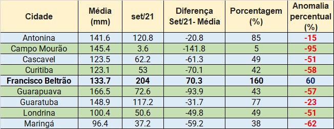 O Sudoeste, onde a situação para o abastecimento era uma das mais críticas do Estado, se destacou positivamente no período. O acumulado na estação de Pato Branco em setembro chegou a 171,8 milímetros, enquanto o volume médio esperado era de 152,6 milímetros. Francisco Beltrão teve média de 204 milímetros, volume 60% maior que a expectativa, que era de 133,7 milímetros.
