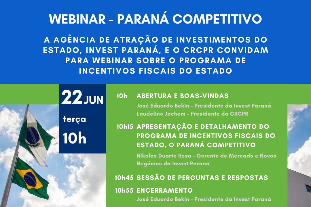 O programa de incentivos fiscais para empresas do Estado do Paraná será apresentado na próxima semana em evento online e gratuito para o Conselho Regional de Contabilidade do Paraná. O webinar será transmitido no dia 22 de junho, às 10 horas, no canal do YouTube da entidade. Para obter a certificação de participação, é necessário se inscrever previamente pelo site do Conselho ou direto pelo link: bit.ly/WebinarParanaCompetitivo.